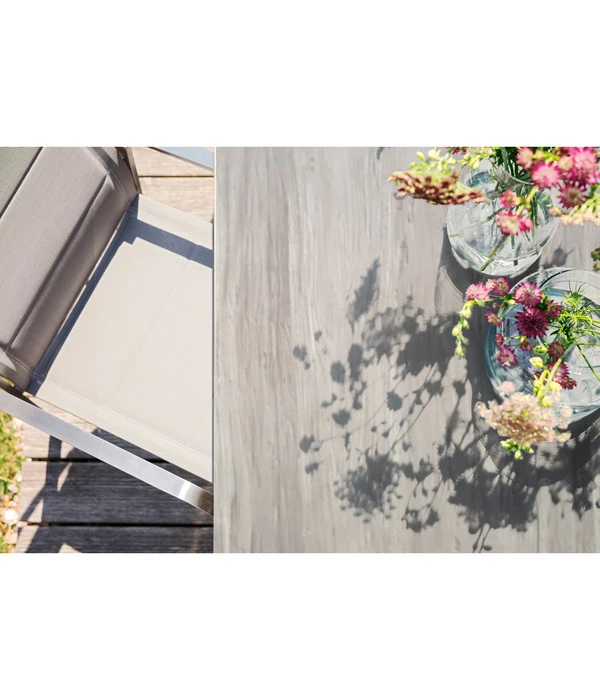 Für seine besondere Ausstrahlung ist neben der klaren Formsprache auch die spannende Materialkombination verantwortlich. Das Gestell besteht aus hochwertigem Edelstahl, der unempfindlich gegenüber Witterungseinflüssen wie UV-Strahlung, Hitze, Kälte, Regen und Schnee ist und deshalb die erste Wahl für den dauerhaften Einsatz im Außenbereich darstellt. Dazu wurde eine extrem schlanke Platte aus HPL kombiniert, die eine innovative Holzoptik zeigt und den Dehner Esstisch Nantes optisch wie funktional perfekt abrundet.